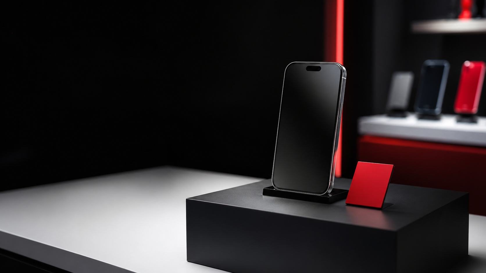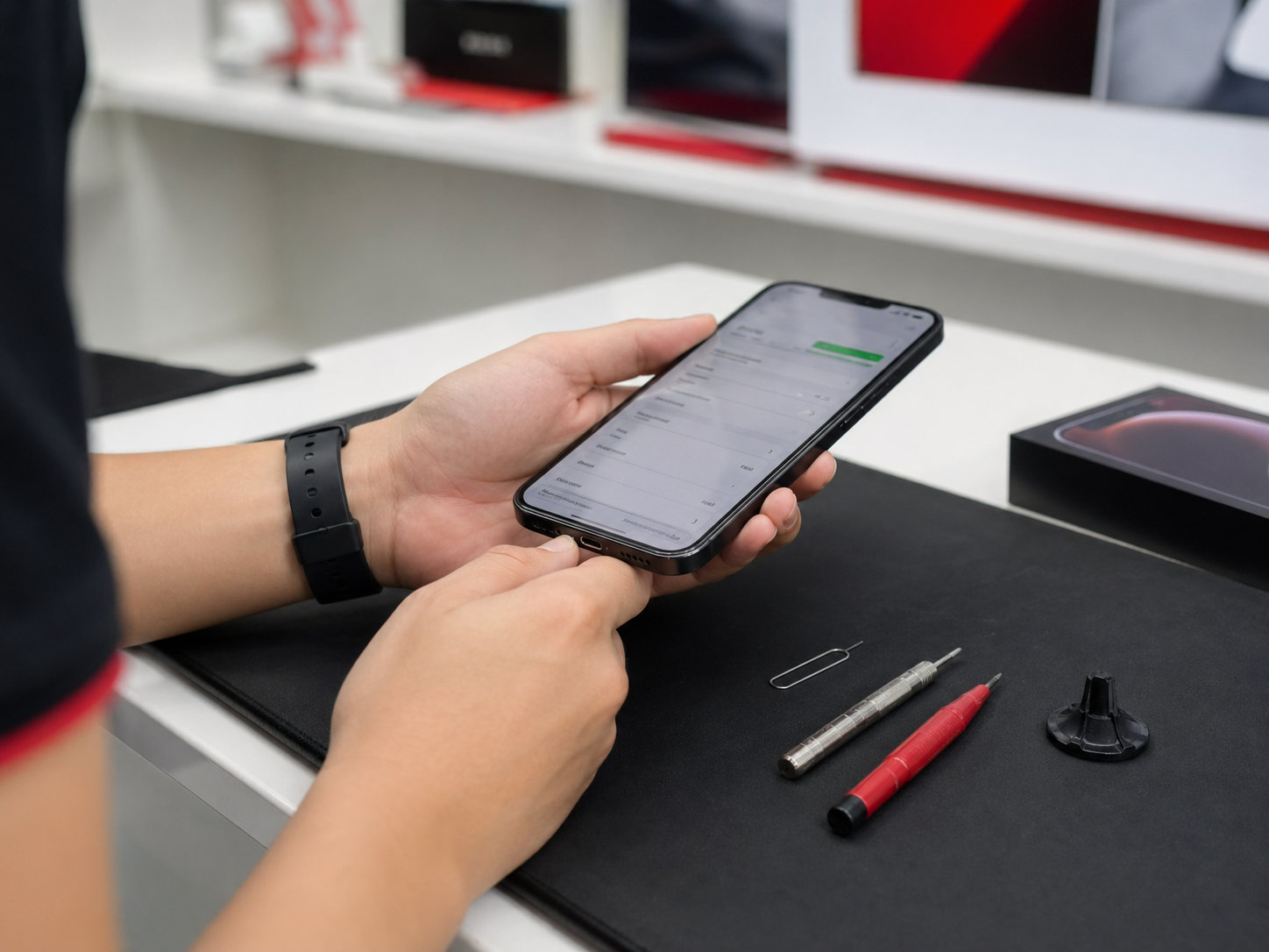 প্রিমিয়াম কাউন্টারে চেকড স্মার্টফোনের পরিষ্কার ডিসপ্লে।