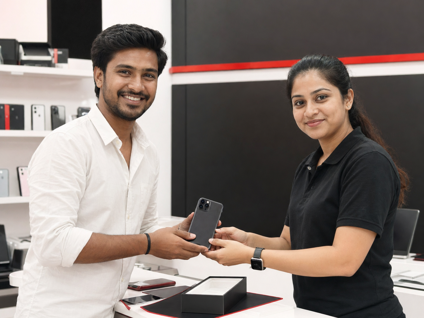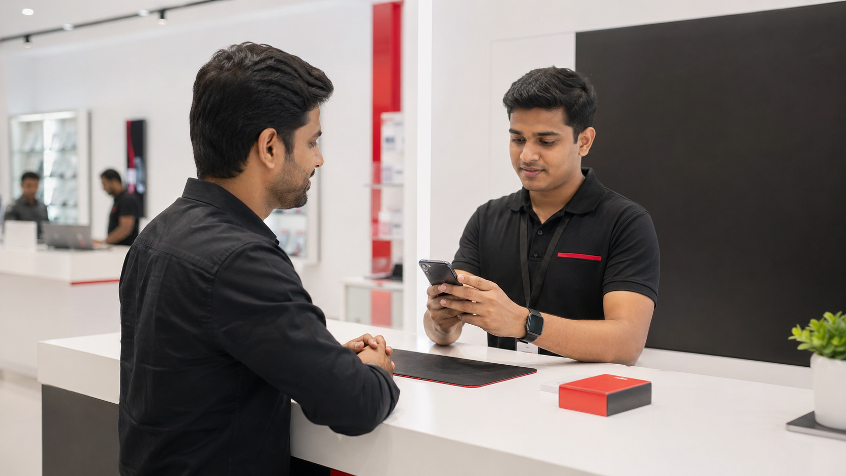 কাস্টমার শপে ঢোকেন, স্টাফ ডিভাইস চেক করেন, কাস্টমার হাসেন, এক্সচেঞ্জ মোমেন্ট।