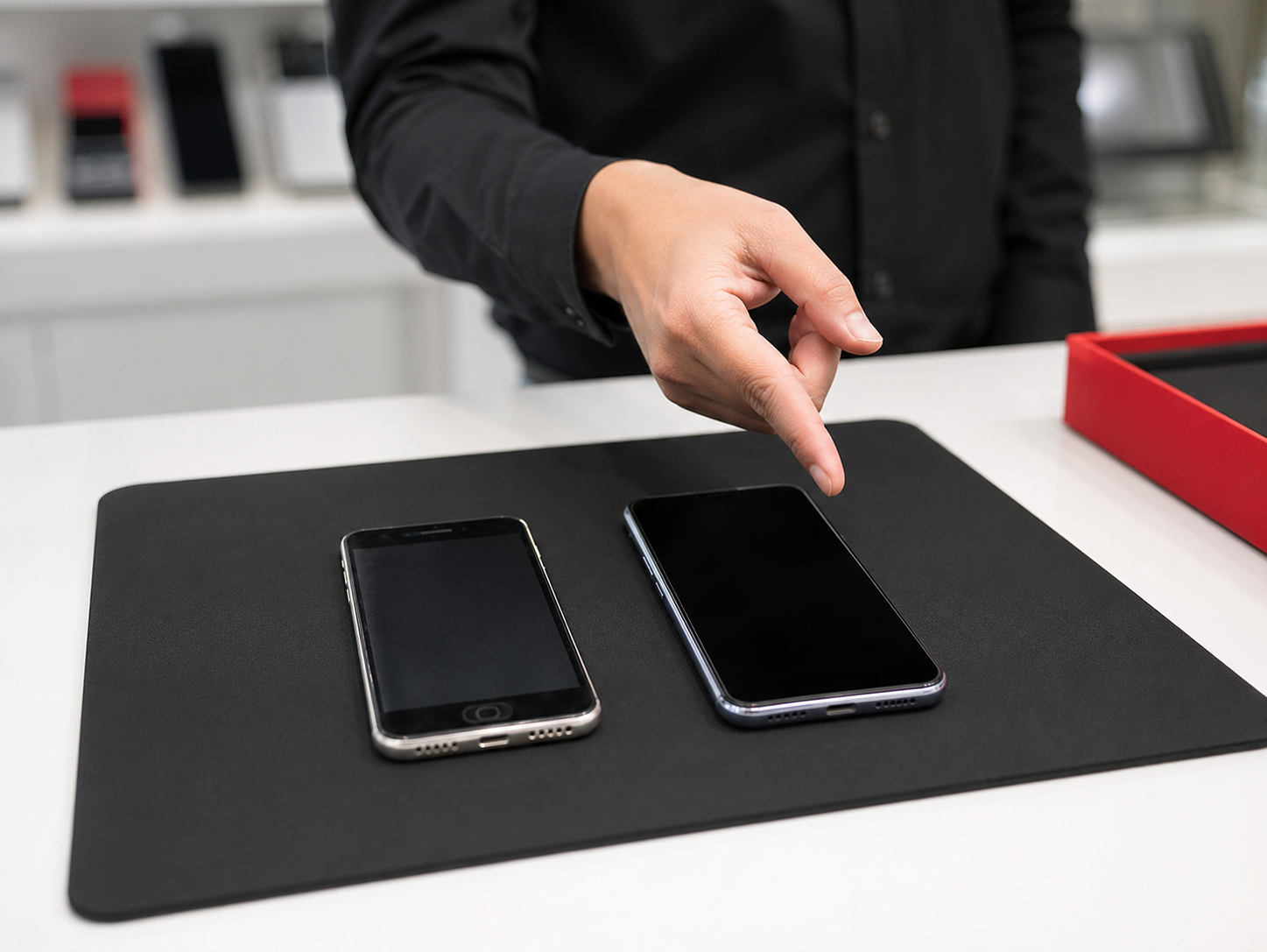 প্রিমিয়াম কাউন্টারে চেকড স্মার্টফোনের পরিষ্কার ডিসপ্লে।